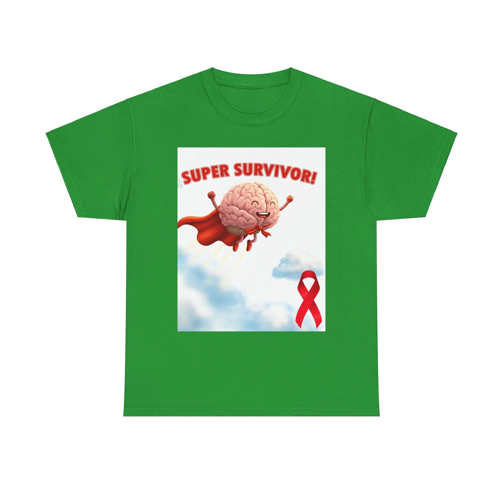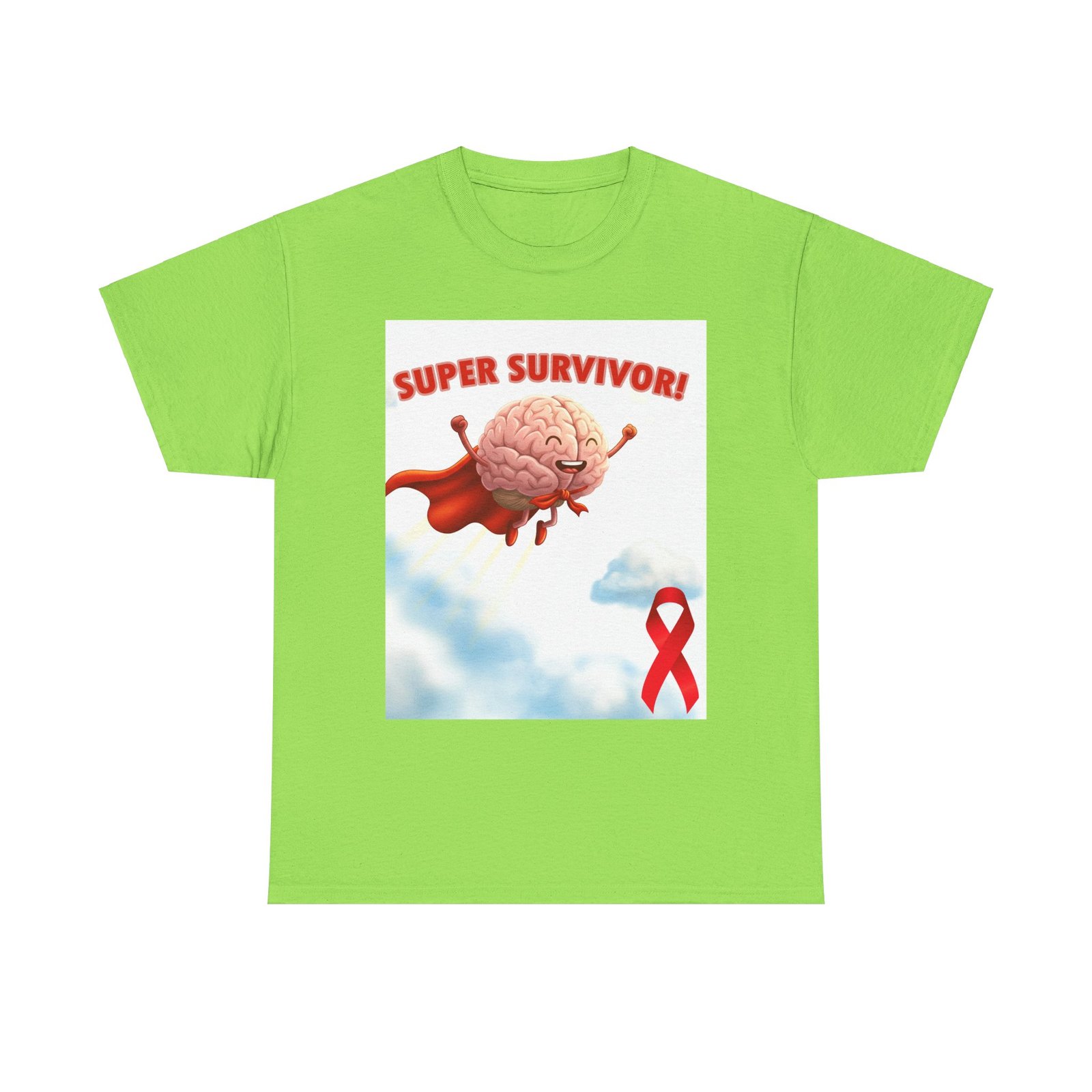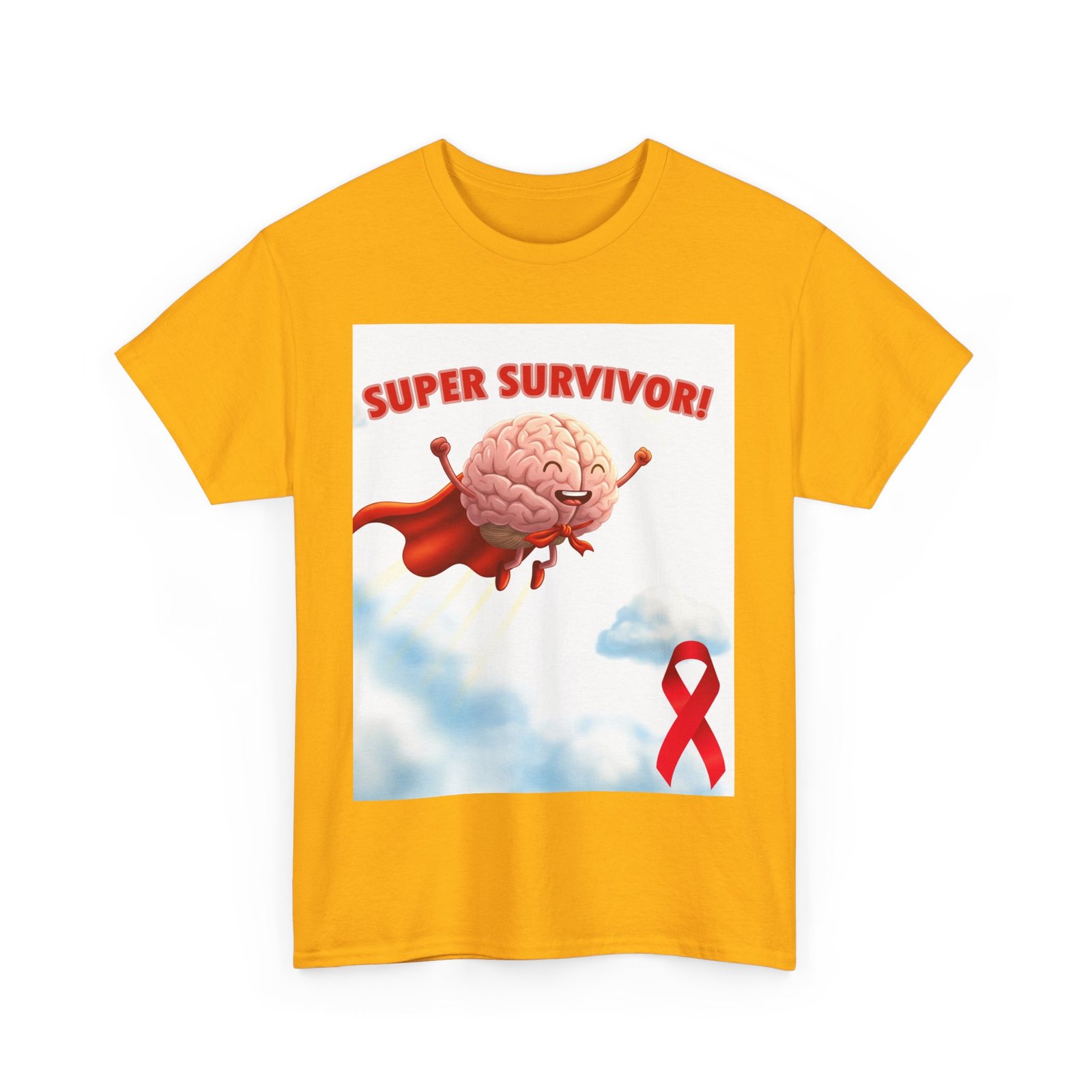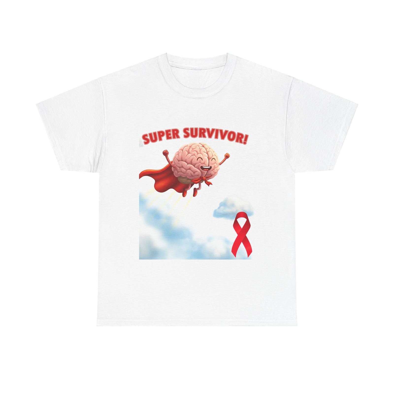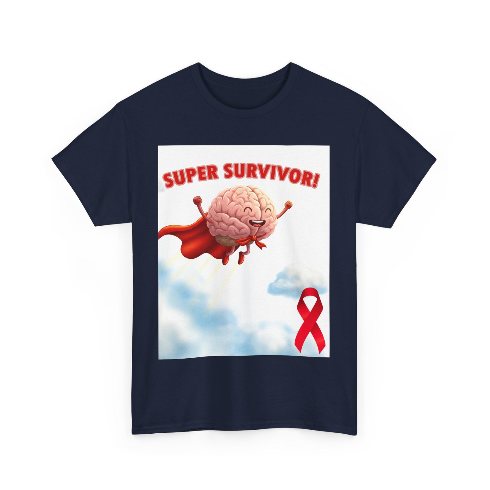 Featuring a high-quality, vibrant cartoon of a smiling brain wearing a superhero cape, soaring high among the clouds with the words “Super Survivor” in bold, comic-style red and yellow fonts, this tee is a lighthearted yet powerful tribute to stroke warriors everywhere.